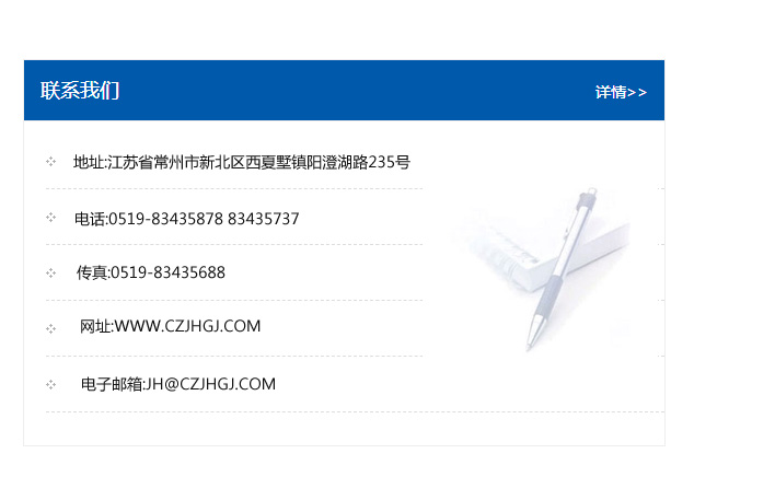 地址:常州市新北區友邦商務大廈1幢16、17層  電話:0519-85101652  傳真:0519-85112595  郵編:213022  網址:www.cz-jiayue_cn.lygssb.com  郵箱:xiajifengaa@163.com
